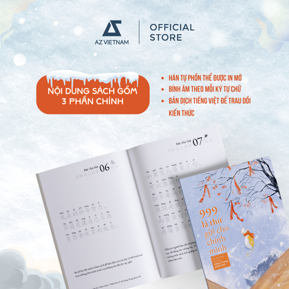Tiếp nối sự thành công của “999 lá thư gửi cho chính mình – Phiên bản tô chữ tiếng Trung” (Sách chữ Giản thể) - mùa đông năm nay, Vanvietbooks trân trọng giới thiệu đến cộng đồng yêu thích tiếng Trung: Cuốn sách “999 lá thư gửi cho chính mình – Phiên bản tô chữ tiếng Trung phồn thể”.