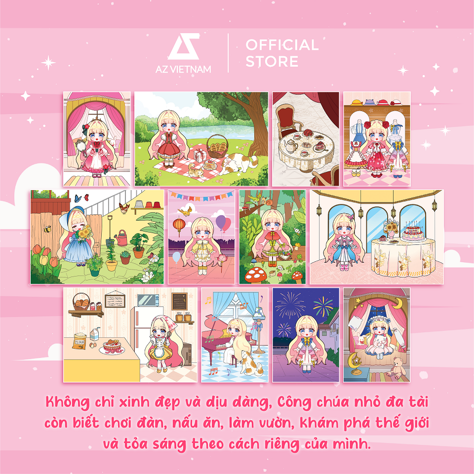 Không chỉ xinh đẹp và dịu dàng, Công chúa nhỏ đa tài còn biết chơi đàn, nấu ăn, làm vườn, khám phá thế giới và tỏa sáng theo cách riêng của mình. Cùng khám phá các hoạt động thường ngày của công chúa nhỏ đa tài qua hơn 100 sticker trang phục, phụ kiện, đồ ăn, cây cối,… được thiết kế tỉ mỉ và đầy màu sắc.
