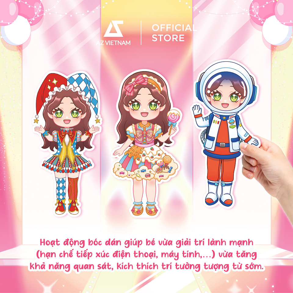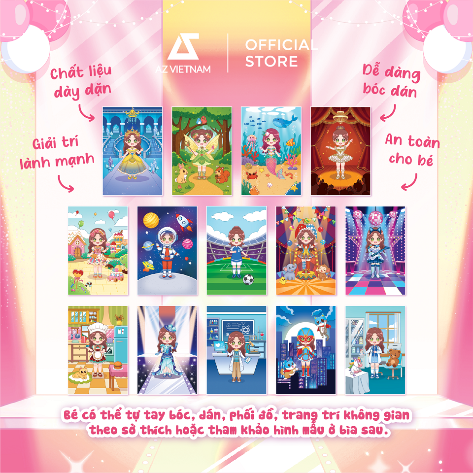 - Bé có thể tự tay bóc, dán, phối đồ, trang trí không gian theo sở thích hoặc tham khảo hình mẫu ở bìa sau.