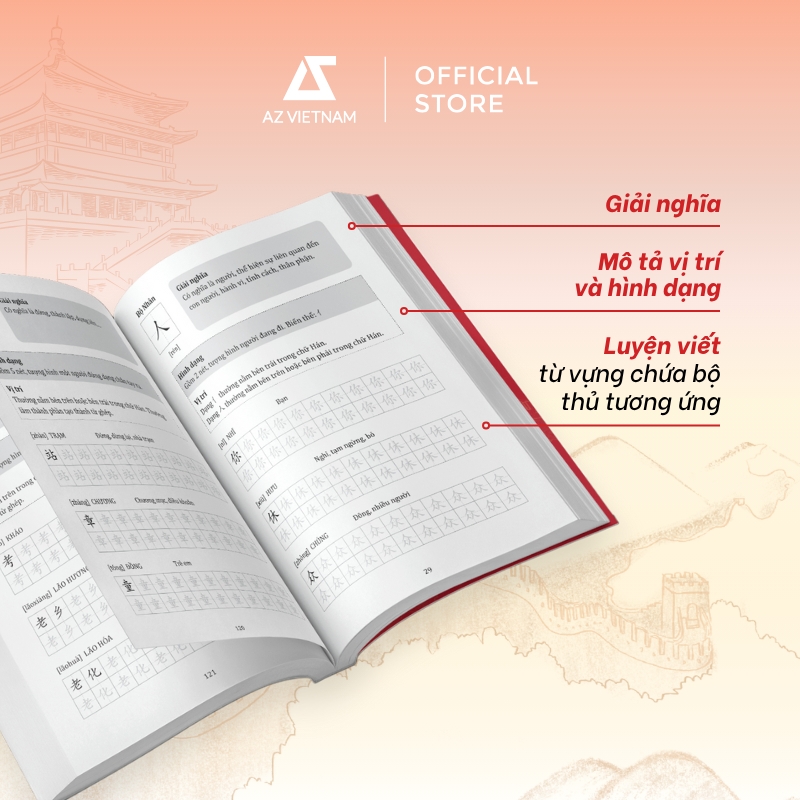 Cuốn sách tổng hợp 214 bộ thủ tiếng Trung, phần gốc rễ cấu thành nên hầu hết các chữ Hán, đây chính là “bản đồ” dẫn lối giúp bạn dễ dàng nhận diện và ghi nhớ mặt chữ. Bên cạnh đó, phần phân tích 100 bộ thủ thông dụng nhất được trình bày rõ ràng, dễ hiểu sẽ giúp bạn nhanh chóng học thuộc từ mới bất kỳ một cách hiệu quả. Cuốn sách còn cung cấp 300 từ vựng ứng dụng cao để bạn luyện viết và sử dụng ngay trong thực tế.