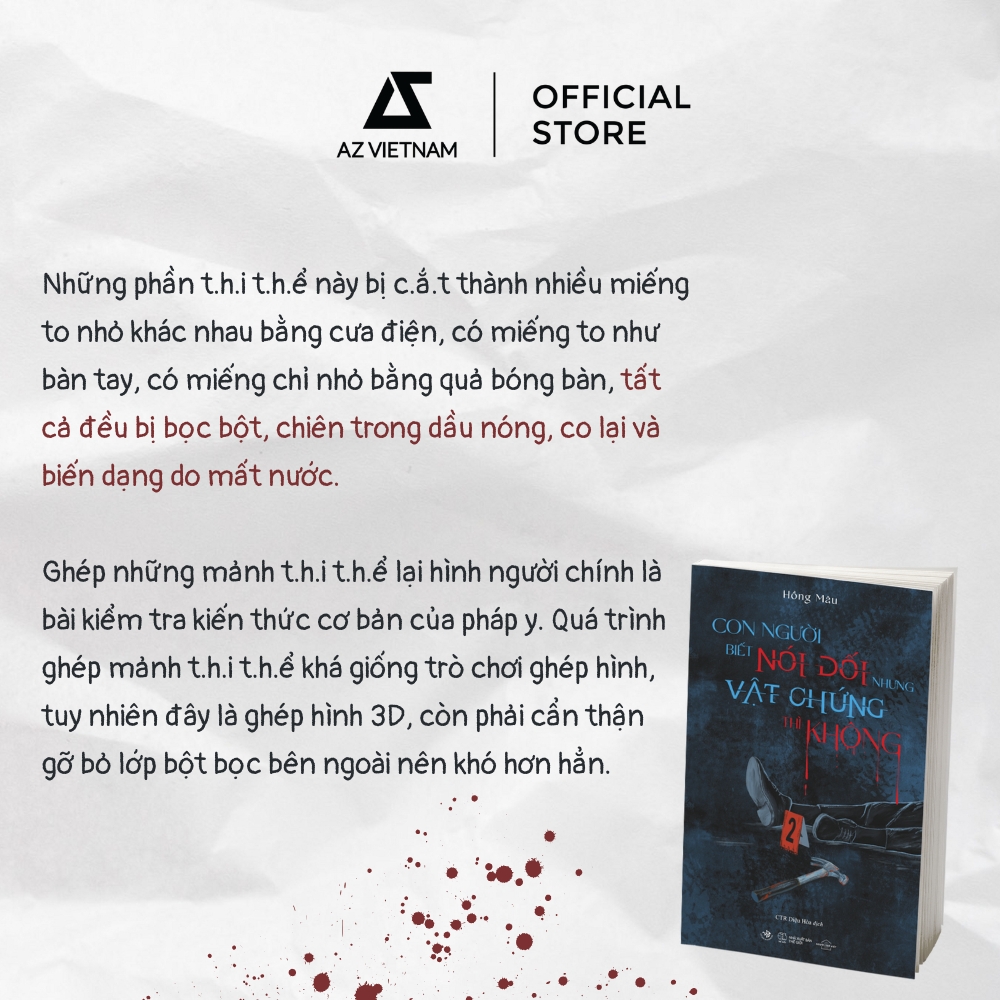 “Con người biết nói dối nhưng vật chứng thì không” là tuyển tập 15 vụ án chấn động có thật: ph…ân th…ây, cưỡ…ng hi…ếp, vứt x…ác, đầu đ…ộc, b…ắt có…c… được kể lại dưới góc nhìn của pháp y Hồng Mâu - người luôn đứng giữa ranh giới mong manh giữa sự thật và lời nói dối, chứng kiến điều khủng khiếp nhất để bảo vệ sự thật. Mỗi vụ việc vừa là thử thách chuyên môn, vừa là phép thử đạo đức và tâm lý của những người làm công tác điều tra. Những mô tả chi tiết về quy trình khám nghiệm, giám định hiện trường, thu thập mẫu vật… đưa người đọc bước vào thế giới lạnh lẽo, chính xác và khốc liệt của khoa học pháp y.
