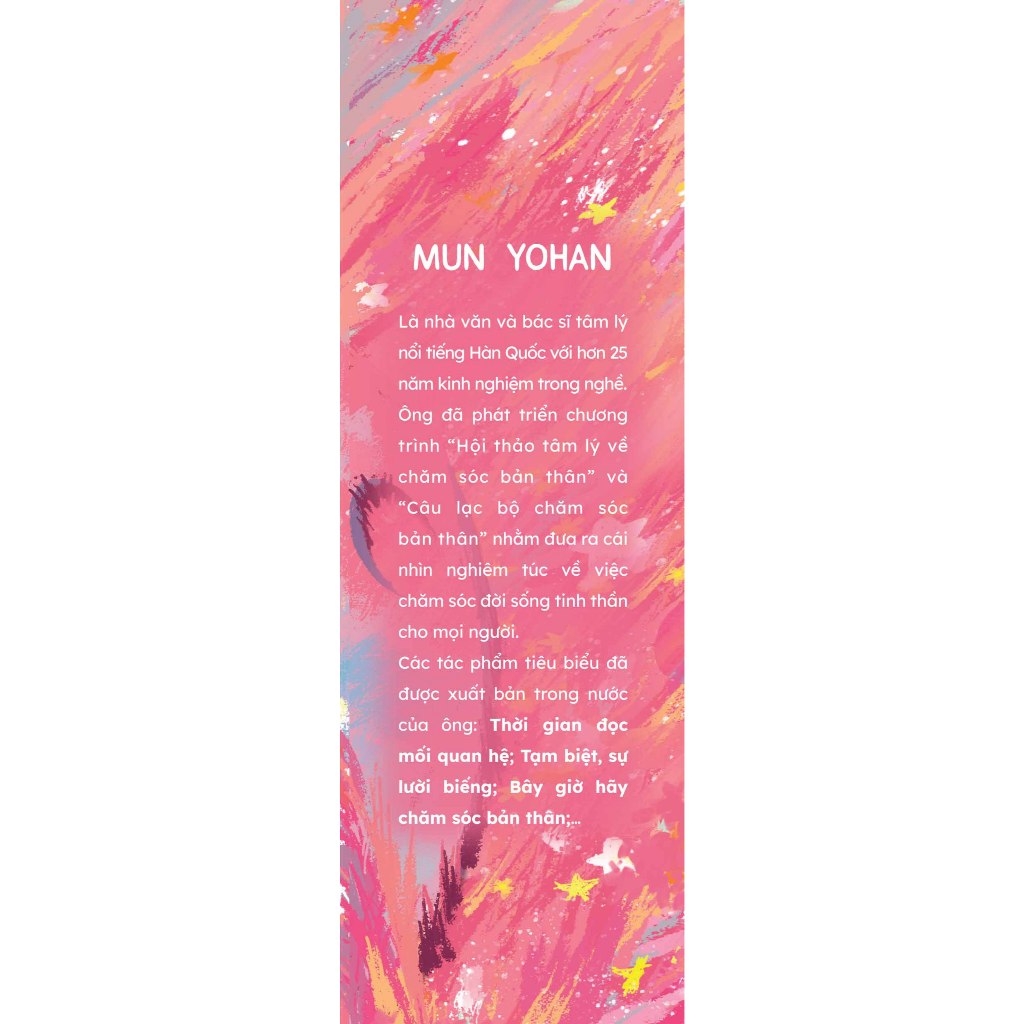 Là bác sĩ tâm lý nổi tiếng Hàn Quốc với hơn 25 năm kinh nghiệm trong nghề, tác giả Mun Yohan sẽ giúp bạn nhận ra nguyên nhân cốt lõi của vấn đề, biết cách yêu thương bản thân. Thông qua những phương pháp thực tiễn như: trở thành bạn của chính mình, nuôi dưỡng niềm tin, sống cho hiện tại… Từ đó bạn sẽ hiểu rằng trên đời này không ai là hoàn hảo, đôi khi nỗi buồn, thất vọng hay tự ti cũng là một phần của cuộc sống.