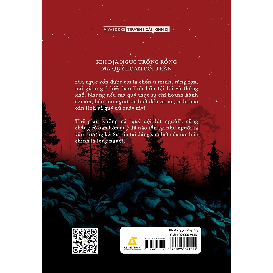 “Khi Địa Ngục Trống Rỗng” là tuyển tập truyện ngắn kinh dị, tâm linh đến từ ngòi bút đa dạng của nhiều tác giả khác nhau. 7 câu chuyện khắc họa những con quỷ, những vong hồn uất hận cùng những cái chết rùng rợn khác nhau, nhưng tất cả đều hướng tới chung một mục đích: đào sâu vào góc khuất tăm tối nhất trong tâm hồn con người.
