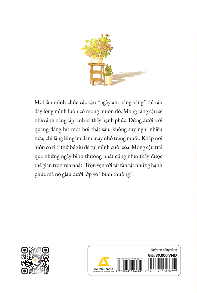 Mỗi lần mình chúc các cậu “ngày an, nắng vàng” thì tận đáy lòng mình luôn có mong muốn đó. Mong rằng cậu sẽ nhìn ánh nắng lấp lánh và thấy hạnh phúc. Đứng dưới trời quang đãng hít một hơi thật sâu, không suy nghĩ nhiều nữa, chỉ lặng lẽ ngắm đám mây nhỏ trắng muốt. Khắp nơi luôn có ti tỉ thứ bé xíu để tụi mình cười xòa. Mong cậu trải qua những ngày bình thường nhất cũng nhìn thấy được thế gian trọn vẹn nhất. Trọn vẹn với tất tần tật những hạnh phúc mà nó giấu dưới lớp vỏ “bình thường”.
