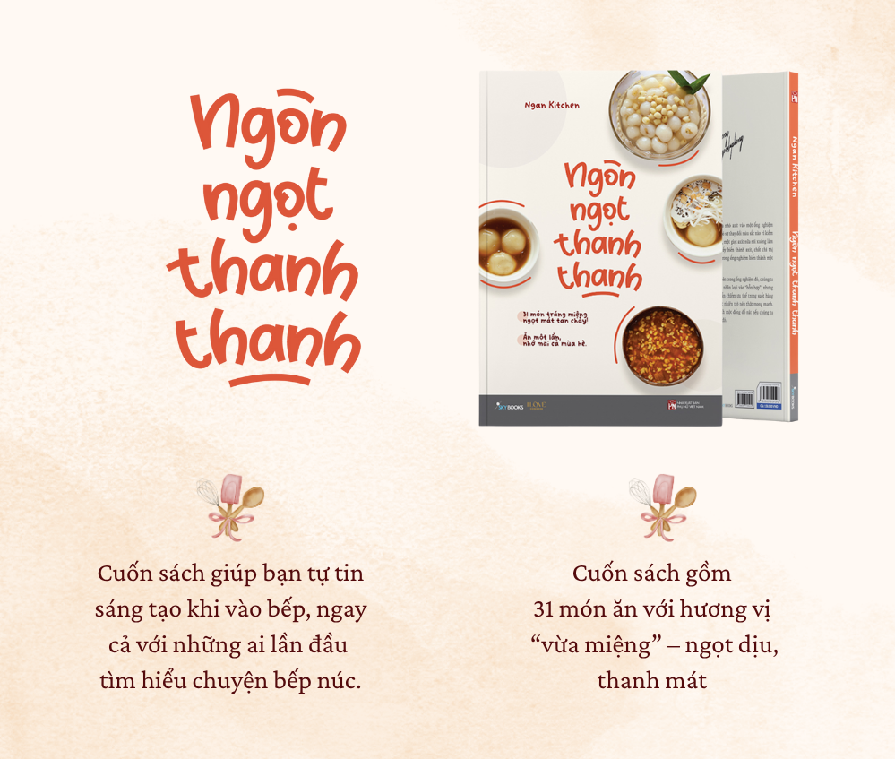“Ngòn ngọt, thanh thanh” không chỉ là cuốn sách dạy nấu ăn, mà còn là một lời mời – mời bạn dừng lại một chút giữa nhịp sống vội, bước vào căn bếp nhỏ, và để mùi thơm của nước cốt dừa, của lá dứa, của đậu xanh lan tỏa khắp không gian. Hãy để căn bếp nhỏ của bạn trở thành góc diệu kỳ, nơi bạn tạo nên những bát chè “ngòn ngọt”, những chiếc bánh “thanh thanh” hay những ly kem mát lành để gửi tới những người thương yêu nhé!