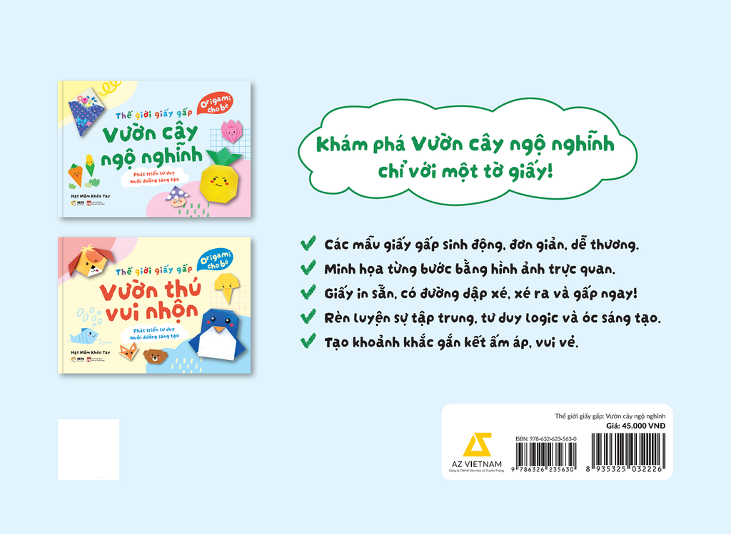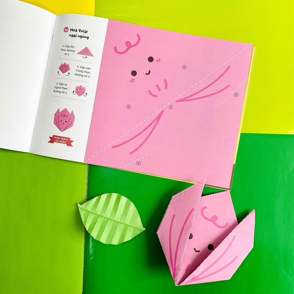 Học mà chơi, chơi mà học với Thế giới giấy gấp: Vườn cây ngộ nghĩnh. Đây là cuốn sách thủ công gấp giấy Origami giúp bé phát triển tư duy, tăng cường sự tập trung, tính kiên nhẫn đồng thời thỏa sức sáng tạo với thế giới thực vật dễ thương.